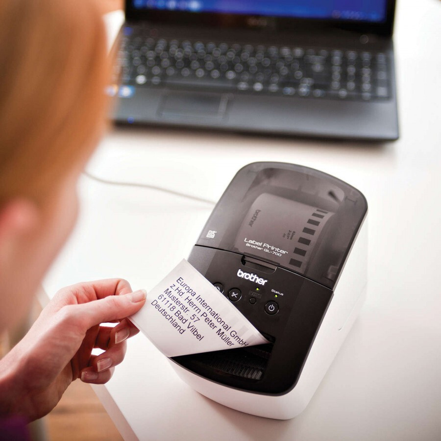 Brother QL-700 imprimantă profesională de etichete cu opțiuni extinse de imprimare. Tipărește pe etichete autocolante sau role de hârtie. Imprimanta Brother QL-700 este indispensabilă nu doar în birouri sau depozite, ci și acolo unde este nevoie de imprimarea ușoară și rapidă a etichetelor de hârtie de diferite dimensiuni. Etichetatorul QL-700 poate imprima până la 93 de etichete de adrese pe minut. Imprimanta oferă software-ul integrat PT Edit Lite în memoria sa internă, care se va lansa imediat după conectarea la orice computer. Puteți utiliza imprimanta Brother QL-700 pentru a imprima etichete de adresă și expediere, etichete pentru dosare, CD/DVD, documente, etichete pentru eprubete sau mostre, sau pentru a imprima ecusoane pentru conferințe.